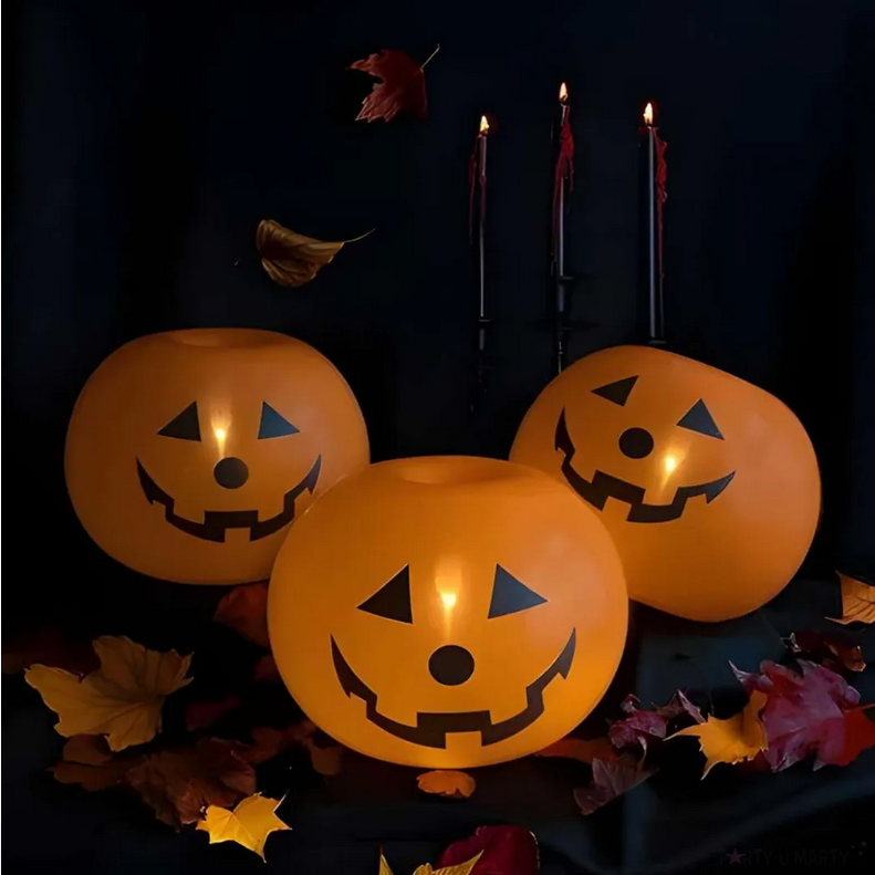 Balon Świecąca dynia to doskonała propozycja na Halloween, połączenie balonu lateksowego z lampionem.