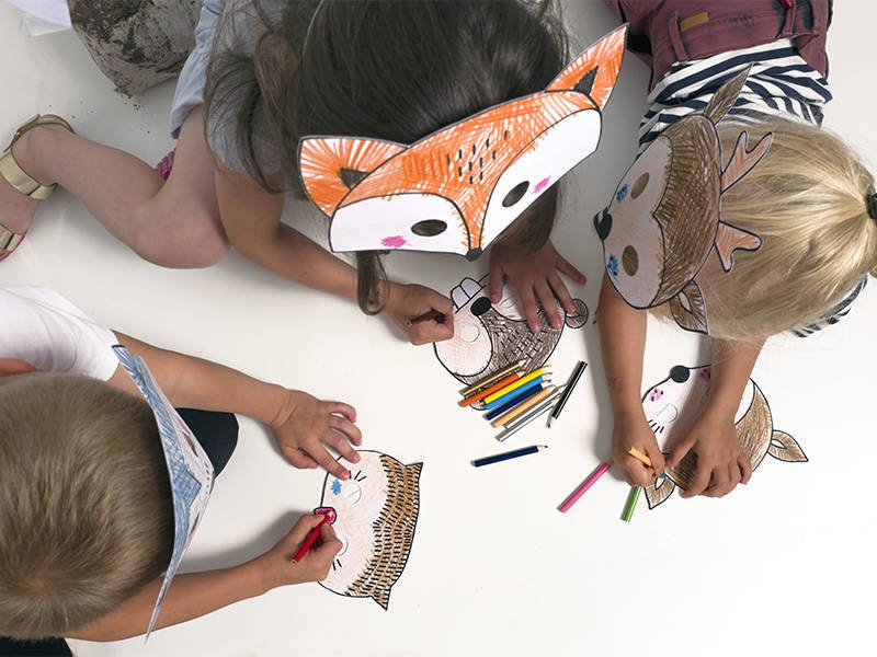 Maseczki w kształcie lisa, bobra, sarny, jelenia, szopa i sowy.