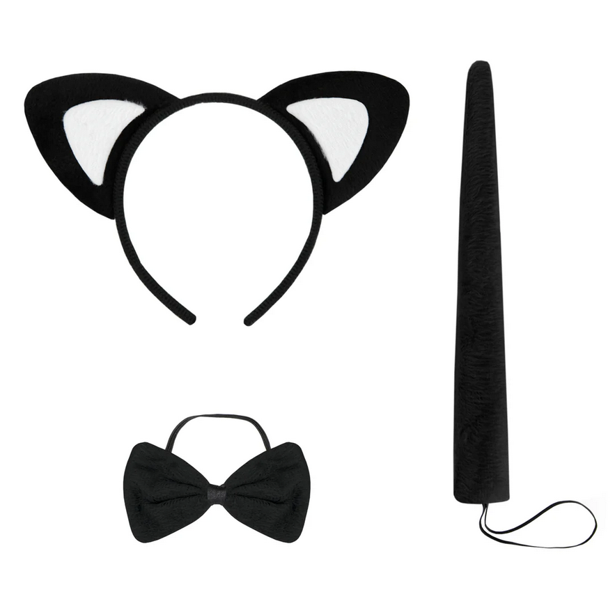 W zestawie: opaska na głowę oraz ogon i muszka mocowane przy pomocy gumki.